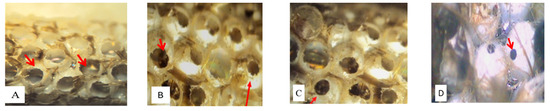 Exit holes of processionary moth larvae (Thaumetopoea pityocampa) (A) and Hymenoptera parasitoids species: Baryscapus servadeii (B), Ooencyrtus pityocampa (C) and Trichogramma embryophagum (D).