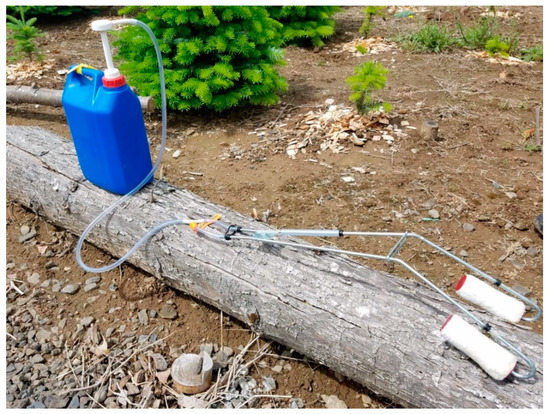 Field trials were established in 2019 and 2020 at three sites in Oregon for two Christmas tree species, noble fir and Turkish fir. Noble fir is the leading Christmas tree species in the Pacific Northwest with yearly plantings averaging around 2.5 million trees. Turkish fir is currently a minor species in terms of planting, but is increasing in popularity due to disease resistance and its ability to tolerate summer droughts. The applications of S-ABA utilized an Easy Roller unit (Easy Roller, Madsen Trees, Kjellerup, Denmark) (Figure 1) to treat the terminal leader of each tree. The unit consists of two 5 cm rollers mounted parallel on the end of two metal extensions with a clamping handle. The roller apparatus connects to a push-pump container by plastic tubing. Treatments were made by placing the two fully saturated rollers on either side of the base of the leader and lightly enclosing the leader by gently clamping the handle. A single upward swipe to the leader provided coverage of S-ABA to both sides of the leader (Figure 2).