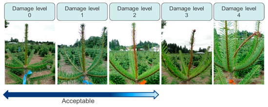 Measurements included leader length at time of treatment (late May/June) and leader length at the end of the growing season in August. Shoot growth was calculated as the difference between the final shoot length and the initial measurement. Untreated check (UTC) trees met the same criteria as treated trees and were evaluated in the same manner. It is important to note that shoot growth in our trials is the growth beyond an acceptable target, not the total length of the leader. We assessed control of leader growth as ‘effective’ if leader growth after treatment was less than 4 cm. Leader damage was evaluated in August on all trees. A scale of 0–4 was used to rank the degree of phytotoxicity damage to leaders (Figure 3) as follows: