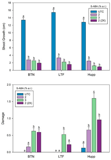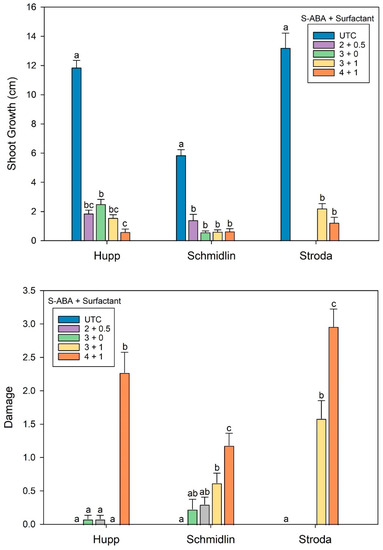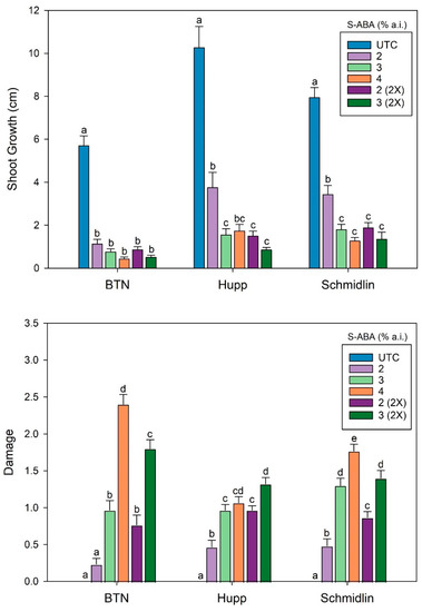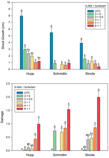 In the 2019 Turkish fir trials, the three test sites showed marked differences in shoot growth beyond the target height (Figure 5). Here, the Schmidlin site exhibited lower excess shoot growth compared to the Stroda and Hupp sites (5.9 cm vs. 11.8 and 13.2, respectively). All S-ABA rates provided significant and acceptable shoot growth control. On Turkish fir at 4% a.i., the damage levels at two of the three sites reached unacceptable levels (>2).