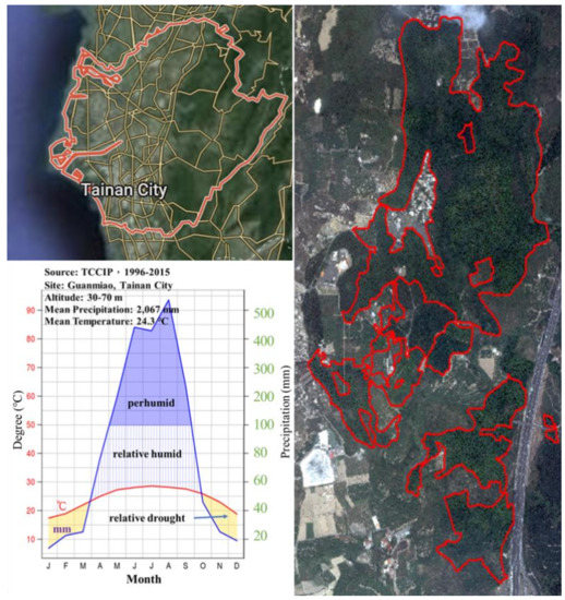The study area of the current study was the Guanmiao Farm in Guanmiao, Taiwan, operated by the Kagome Corporation. The area has an altitude of 30–70 m and a slope of 12°–45° and the soil texture of the region is loamy. Gridded observations of temperature and rainfall in the study area from 1996 to 2015 were provided by the Taiwan Climate Change Information and Adaptation Knowledge Platform (TCCIP). The average annual temperature of the study area was 24.3 °C whereas the average annual total rainfall was ~2067 mm, with the rainy season occurring between May–September. Figure 1 shows the location and climate of the study area.
