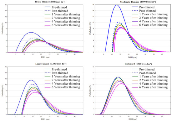 The present study summed the values of the a and b parameters. In the sixth year after logging, the rank of the different thinning treatments in terms of the summed parameters was: intensely thinned (24.93) > moderately thinning (20.92) ≈ light thinning (21.06) > un-thinned (18.87). The rank of the thinning treatments in terms of a + b in the 6th year after logging was: intensely thinned (4.13) > moderately thinned (3.10) > light thinned (2.84) > un-thinned (2.63). Both the total and difference values increased with the increase in thinning intensity. The range of scale increased with the increase in thinning intensity, consistent with the results of previous studies [4,6,9,15]. The c-values in all six periods of the simulation maintained a positive skewed distribution of <3.6. The continuous decrease in c-values may indicate that some silviculture trees experienced stagnant or slow growth, resulting in an increase in the number of relatively small diameter silviculture trees.