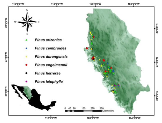 Eighty populations (seed stands) of six pine species were randomly selected in the Sierra Madre Occidental (SMO), in the states of Durango and Chihuahua. The SMO is the longest and most continuous mountain system in Mexico (Figure 1). The sampling points (locations) were randomly selected from the potential distribution maps of the six pine species studied [44].