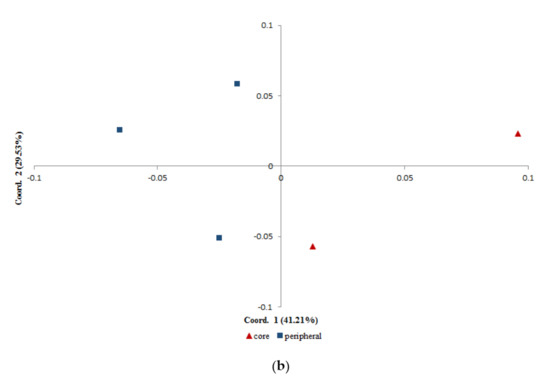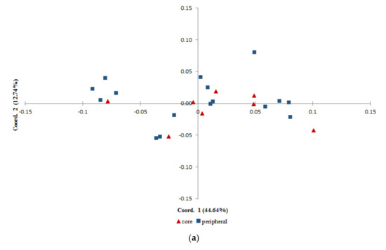 Contrasting results have been obtained. Some authors have concluded that genetic diversity is similar, and differentiation is greater in peripheral than in central populations [28,29]. However, in some cases, no evidence was found in peripheral populations for the greater genetic differentiation, lower genetic diversity and asymmetric genetic flow predicted by the central–peripheral hypothesis [30,31,32,33]. Therefore, results of empirical research remain ambiguous and limited [8,32,34,35].