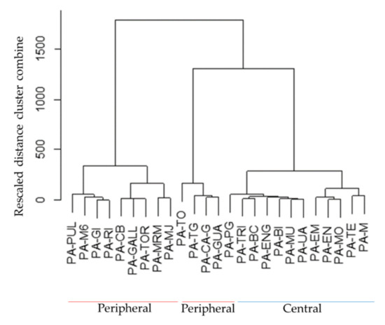 Ward’s method was used for hierarchical clustering of P. arizonica populations. Three main groups were formed within central and peripheral populations. The peripheral group from PA-TO to PA-GUA was more similar to the central group than the peripheral group formed by PA-PUL to PA-MJ. This pattern may depend on the elevation.