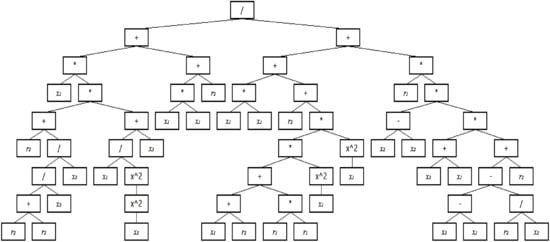 A genetic model of the four-point bending force is developed using GPdotNET software [45]. The output variable is the bending force of thermally modified wood (Table 3). The population size is expected to correlate positively with the quality and rate of convergence of the solution. Mutation probability is a key parameter that allows GP new genetic material to be introduced into the population and obtain better solutions. Therefore, a significant complex effect of mutation on the solution’s quality is expected. The number of generations should be positively correlated with the quality of the solution and negatively correlated with the program execution rate. Figure 2 shows a model of the bending force of thermally modified wood in the form of an expression tree. Table 3 lists the experimental results and the results calculated with the obtained GP model of bending force.