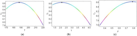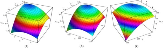 Graphic representation of the function: (a) (YT, maximum bending force depending on the duration of the process (t) and wood density (), (b) (YT, ) maximum bending force depending on the process temperature (T) and wood density (), (c) (YT, t) maximum bending force depending on the process temperature (T) and the duration of the process (t).