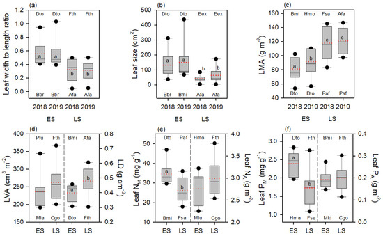 (a–f) Leaf characteristics of 18 species at high-elevation site (Sigira). (a) Leaf shape (i.e., leaf width to leaf length ratio: W/L), (b) leaf size, (c) leaf mass per unit area (LMA), (d) leaf volume per area (LVA), leaf density (LD), (e) leaf nitrogen (N) per unit mass (NM) and area (NA), and (f) leaf phosphorous (P) per unit mass (PM) and area (PA). Leaf shape, size and LMA (a–c) were measured in both 2018 and 2019. Leaf N and P were measured in 2018 and LVA and LD in 2019 only (d–f). The boxplot boundary indicates the 25th and 75th percentile, the error bars indicate the 95th and 5th percentiles, the black solid line and the red dotted lines inside the boxes indicate median and mean, respectively. The black dots show the highest and lowest species means, for which species codes (see Table 2) are indicated in the lower and upper part of the figure. Different letters (a–c) inside boxes indicate significant differences (p < 0.05) of the mean between early (ES) and late (LS) successional species and years when relevant.