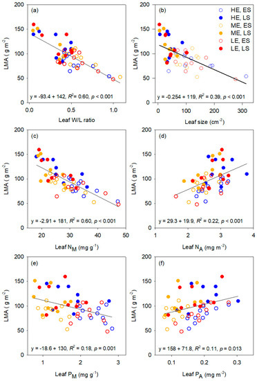 (a–f) Leaf mass per unit area (LMA, y axis) in relation to (a) leaf width-to-length ratio (leaf W/L ratio); (b) leaf size; (c) leaf nitrogen per unit mass (Leaf NM); (d) leaf nitrogen per unit area (Leaf NA); (e) leaf phosphorus per unit mass (Leaf PM); (f) leaf phosphorus per unit area (Leaf PA). Each data point represents species mean at each site. HE, High-elevation site (Sigira); ME, Medium elevation site (Rubona); LE, low elevation site (Makera); ES, early successional trees; LS, late successional trees. Lines, equation and R2 represent the regression line for all sites and successional groups. p-value refers to the regression line.