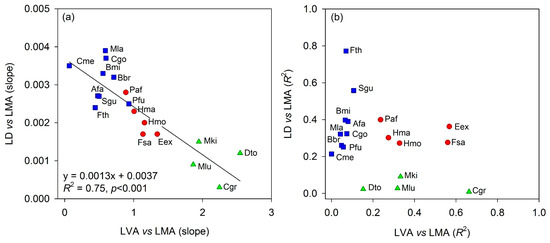 Slope (a) and R2 (b) for leaf density (LD) versus leaf mass per unit area (LMA) in relation to slope and R2 for leaf volume per unit area (LVA) versus LMA for 18 species (for species codes, see Table 2). Blue squares, LMA mainly influenced by LD; green triangles, LMA mainly influenced by LVA; red circles, LMA influenced by both LD and LVA. p-value refers to the regression line.