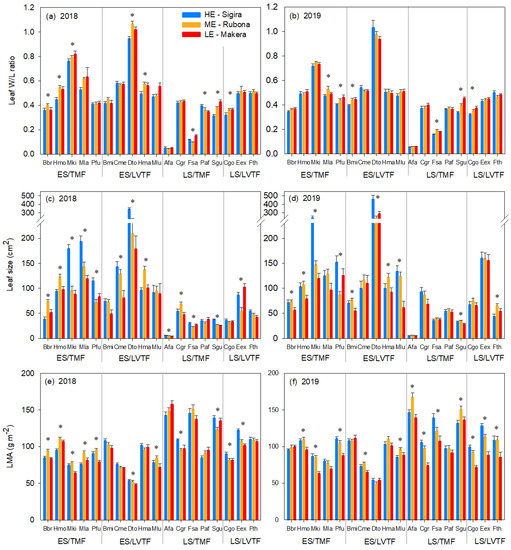 (a–f) Site (i.e., warming) effect on (a,b) leaf width-to-length ratio (W/L), (c,d) leaf size and (e,f) leaf mass per area unit (LMA) in 18 species (see Table 2 for full names) measured at three sites of different elevation (HE, ME and LE, high, mid and low elevations, respectively) in (a,c,e) 2018 and (b,d,f) 2019. The species are divided into four groups, depending on successional stage and forest type of origin. ES and LS, early and late successional, TMF, tropical montane forest and LVTF, Lake Victoria transitional forest. * indicate statistical differences between sites within species (p < 0.05); see Table 3 for detailed statistical results. Note the broken axis for leaf size.