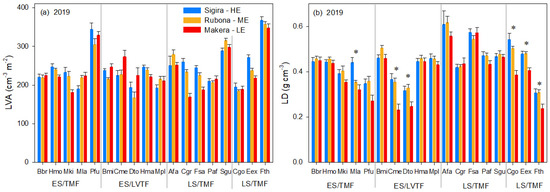 Leaf size, leaf W/L ratio, LMA, LVA, LD, NM, NA, PM and PA varied greatly across species, as shown for the HE (Sigira) site (Figure 1a–f, Table S1). The difference between the two years was small and only significant for a relatively small difference in LMA within the ES group (11% lower in 2018 compared to 2019). The successional strategy of the species contributed largely to the inter-specific variation, as a significant difference between ES and LS species was observed for most variables except LVA, NA and PA content. In general, ES species had significantly higher leaf W/L ratio, LA, NM and PM, and lower LMA and LD compared to the LS species. D. torrida was often in the extreme position within the ES group while A. falcatus and F. saligna (depending on variable) shared the extreme position within the LS group. The species within a successional group that overlapped with species within the other group were more variable, but F. thonningii, classified as LS species, often had ES features that sometimes even exceeded the range of the ES species (Figure 1a,c,e,f).