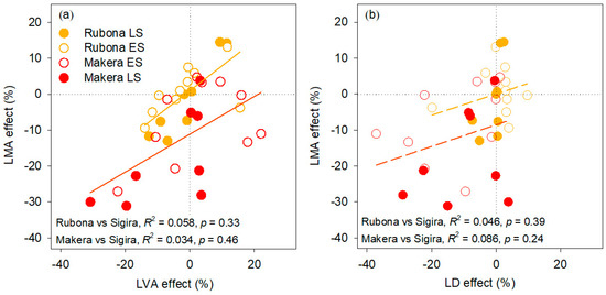 The results on the contribution by LD and LVA to warming-induced shifts in LMA are less consistent with previous research. We hypothesised that LD contributed more than LVA to shifts in LMA at higher temperatures, based on the global meta-analysis [21]. Indeed, there was a species-dependent effect of site on LD (declines in six species) but not on LVA (Table 3 and Table 4). However, when the site effects on LVA and LD were compared with site effects on LMA using regression analysis, we found a significant positive correlation for LVA only (Figure 6). This suggests that shifts in both LVA and LD contributed to warming-induced changes in LMA, but that the contribution by shifts in LVA is consistent across species, while the contribution by LD is strong, but only for a few species. Therefore, the second part of hypothesis #1, that mostly LD affected the warming response of LMA, was not confirmed.