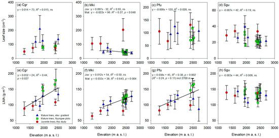 (a–h) Leaf size and leaf mass per area unit (LMA) at different elevations for Cgr, Carapa grandiflora (a,e); Mki, Macaranga kilimandscharica (b,f); Pfu, Polyscias fulva (c,g); Sgu, Syzygium guineense (d,h) in three independent studies in Rwanda. Each data point shows mean ± SD at each site included in the studies. Blue triangle, mature-tree elevation-gradient study; green square, permanent monitoring plots in Nyungwe forest with mature trees; red circle, elevation-gradient study with juvenile trees (Rwanda TREE, this study); lines, equation and R2 represents the regression line for all tree studies. p-value refers to the slope coefficient.