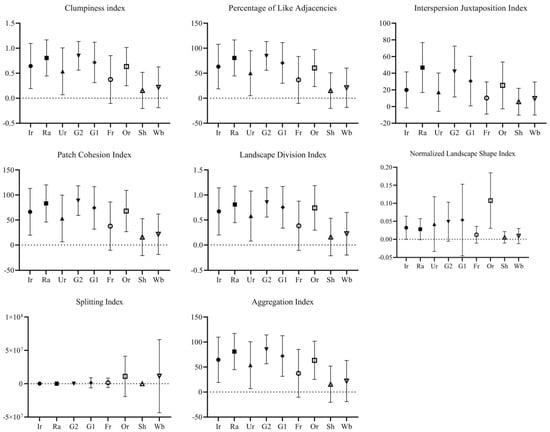 The result of landscape configuration metrics, which were calculated using land use/land cover map, were depicted using three statistics, including mean and the upper and lower standard deviations (Figure 2).