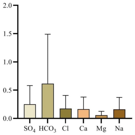 The results indicated that the sulfate (0.25 ± 0.33 gr ha−1 yr−1), bicarbonate (0.61 ± 0.87 gr ha−1 yr−1), chlorine (0.17 ± 0.23 gr ha−1 yr−1), calcium (0.16 ± 0.21 gr ha−1 yr−1), magnesium (0.05 ± 0.07 gr ha−1 yr−1), and sodium (0.16 ± 0.21 gr ha−1 yr−1) are annually exported from the terrestrial ecosystems of the study catchments into the rivers. Figure 3 indicates the box-plot of the CECs of sulfate, bicarbonate, chlorine, calcium, magnesium, and sodium.