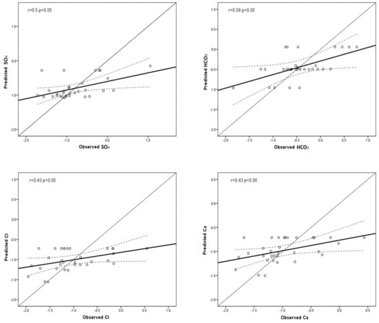 To validate the models, the predicted versus observed values were depicted, as were shown in the one-by-one relationships (Figure 4). Moreover, the results of the calculation of three error groups, which include the relative error metrics, efficiency metrics, and absolute error metrics, have been summarized in Table 6. The models indicated a relatively moderate performance in predicting the CECNa, CECSO4, CECHCO3, CECCa, and high performance in predicting the CECCl, CECMg referring r2 coefficients.