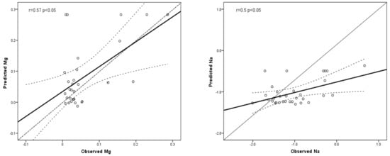 Table 5 shows that 50–57% of the total variation in the CECs of sodium and magnesium were expressed by change in the interspersion juxtaposition index of the moderate-density grassland patches. The CECs of magnesium and that of sodium were inversely associated with the interspersion juxtaposition index. Implicitly, the discontinuity of the moderate-density grassland patches degrades the river water quality in the study catchments by accelerating the magnesium and sodium washouts from the terrestrial ecosystems into rivers. Landscape configuration has an important role in nutrient runoff from the catchment []. Shen et al. (2014) have also shown an inverse relationship between the interspersion juxtaposition index and unused land, which are in contrast with those of this study []. Sullivan et al. (2004) suggested that the division of land into smaller plots may lead to an increase in the number of junctions amongst drains, which will thus increase surface and subsurface flows and consequently cause washing of more pollutants and nutrients out into the aquatic ecosystem, such as rivers, lakes, and wetlands [].