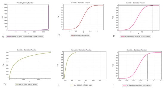 The cumulative density function for the simulated regression models (A): SO4, (B): HCO3, (C): Cl, (D): Ca, (E): Mg, (F): Na.