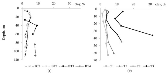 The soils of the background sites, occupying automorphic relief positions (BT1, BT2), are composed of sands. Depending on the horizon, sand particles take 89.9–97.3%, silt 0.6–6.3% and clay 1.5–5.6%. The distribution of clay particles is of a distinct eluvial-illuvial character (Figure 2). Under semi-hydromorphic (BT3) and hydromorphic (BT4) conditions, the share of clay particles in mineral profile part increases to 6.8–9.4% as the share of sand decreases to 86.6–87.6%. In this regard, the soils at BT3 and BT4 are texturally characterized as loamy sand.