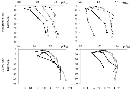 The profile distribution of pHH2O and pHKCl values in the background and quarry soils. All abbreviations are explained at Table 1.
