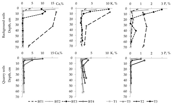 The profile distribution of total content of biogenic elements Ca, K, and P in the background and quarry soils. All abbreviations are explained at Table 1.