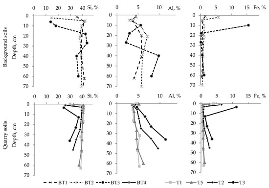 The profile distribution of total content of Si, Al and Fe in the background and quarry soils. All abbreviations are explained at Table 1.