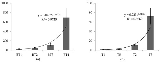 Together with the development of vegetation cover in the quarry, the young soils form organic horizons (forest litter). The organic matter stocks in the litter horizons of young soils are significantly lower than those in the background soils. In both cases, an exponential increase in organic matter stocks was observed (Figure 7): from 22.4 ± 11.9 (BT1) up to 694.0 ± 202.5 t ha−1 (BT4) in the background soils, from 1.3 ± 0.4 (T1) up to 72.4 ± 17.3 t ha−1 (T3) in the young soils.