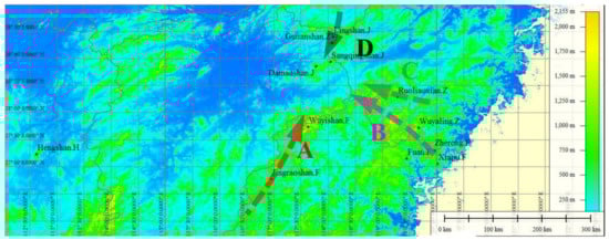 Geographic distribution of the 12 sampled populations of C. chekiangoleosa. The dots in the figure are the collection points of each test sample. A—Wuyi mountain range population; B—Donggong mountain range population; C—Xianxia mountain range population; D—Huaiyu mountain range population.