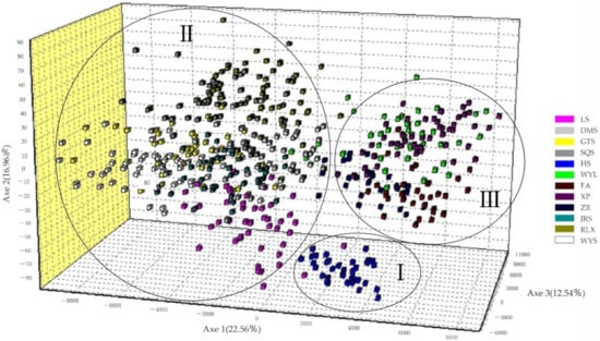 According to 3D graphics of factorial correspondence analysis, the 12 populations were divided into 3 groups: Group I, Group II, and Group III. Group I was the western cluster, and only contained HS groups; Group II was a central cluster with DMS at its core, which was distributed on the ridge connecting the Huaiyu Mountain Range to Wuyi Mountain Range in the south, and included the LS, GTS, SQS, DMS, RLX, WYS, and LRS populations; Group III was an eastern coastal cluster with WYL at its core, including the WYL, ZR, FA, and XP populations (Figure 2). There were certain genetic differences among the groups, especially between the HS population and the other populations.