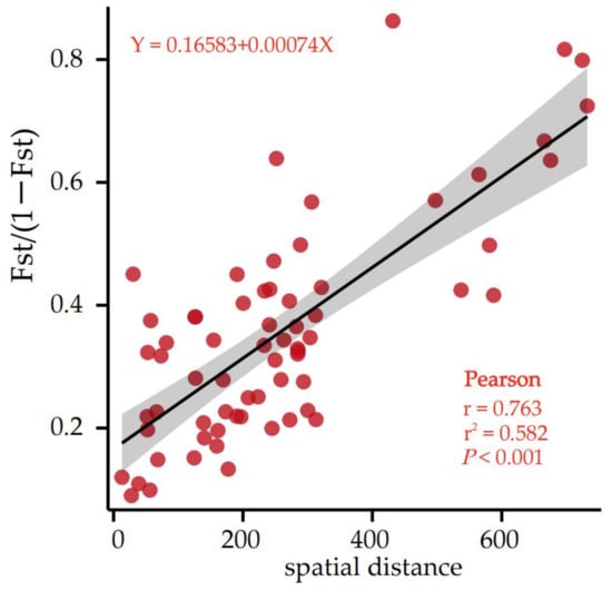 In addition, the correlation analysis between genetic differentiation (FST/1 − FST) and spatial geographical distance was conducted (Supplementary Materials Table S3) to check whether isolation by distance (IBD) existed. The correlation analysis showed that the correlation between the 2 groups was very significant (r = 0.763, p < 0.001), indicating that geographical isolation is the main cause of genetic differentiation (Figure 3).