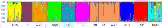 The genetic structure of the 12 studied populations was inferred using the STRUCTURE software. The most probable division with the highest ΔK value was detected at K = 10 (Supplementary Materials, Figure S1a,b). Figure 4 showed the genetic structure of the 12 C. chekiangoleosa populations, simulated based on the mathematical model. Each color represents a genetic cluster, and the colored segments show the individual’s estimated ancestry proportion to each of the genetic clusters. The 12 populations were clustered into 10 clusters. The DMS population presented the most gene introgression from the GTS, WYS, SQS, LS, and XP populations. The GTS population presented the most gene introgression from the WYS population and LS population. However, the ZR, FA, and WYL populations were mixed, and the degree of differentiation between these populations was extremely weak. Genes from the XP and LS populations mainly infiltrated the mixed group composed of the last three populations. In the SQS, LS, and XP populations, there were also some individuals with similar genetic backgrounds to the GTS population, and the HS population was the most independent.