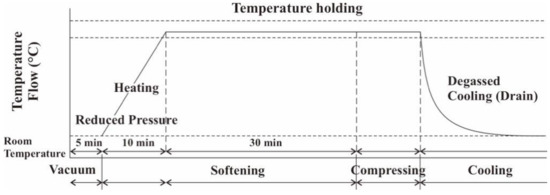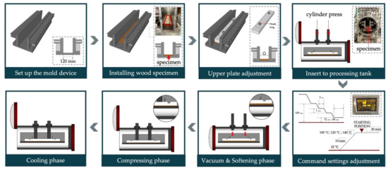 The experiment was carried out in the high-temperature and -pressure apparatus HTP-50/130 (HISAKA Company, Osaka, Japan) at the Graduate School of Environmental Engineering, The University of Kitakyushu, Kitakyushu, Japan. The system consisted of the processing tank and boiler setting machine. The experimental procedure for the Albizia falcataria board at high-temperature and -pressure is visualized in Figure 1. The procedure begins with setting the mold device, inserting the wood specimen into the mold device, adjusting the upper plate on the mold device, inserting the mold device into the processing tank, selecting, and adjusting the experimental order settings, and, finally, performing the consolidation process of high-temperature and -pressure treatment.