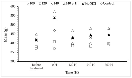 Figure 4 shows the specimen masses measured. The mass of the wood increases rapidly after treatment; after 120 H, it decreases and stabilizes. However, the final mass of the specimen was higher than the original mass. Treatment at high-temperature and -pressure resulted in the greatest increase in wood mass (30% at 100 °C) and smallest increase (7% at 120 °C) immediately following treatment. After 120 H, the highest change in wood mass occurred in the 140 °C S [1] category, while the lowest occurred at 120 °C, at 4 and 2%, respectively. After 240 H, the largest changes occurred in the 140 °C S [1] and S[2] categories, while the smallest changes occurred in the 120 °C, at 7 and 1%. Furthermore, after 360 H, the highest changes occurred at temperatures of 100 and 140 S [1] and S [2], totaling 7%, while the lowest changes occurred at 120 °C and 140 °C, totaling 5%. This result can be confirmed from the mass data shown in Table 2, where the highest value is found in the 140 S [1] and S[2] category. The ANOVA showed that there were significant differences (F = 6.371; p < 0.05) in the percentage change in mass found in treated wood, with respect to the control sample (Table 1). Thermal deterioration of thermally treated wood was determined to be the cause of mass loss [43]. Furthermore, Tenorio and Moya [44] investigated mass loss during heat treatment and discovered that it is species- and treatment-intensity dependent.