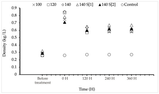 As shown in Table 3, treated Albizia falcataria (0.62 kg/L) had a higher average density than untreated (0.29 kg/L). The treatment increased the density by an average of 112.78%. The densities of Albizia falcataria board, after treatment under various temperature conditions, are presented in Figure 5. The density increase was accomplished by reducing the volume of the wood, since the compression process was dependent on the viscoelastic nature of the wood [45]. The densities of the wood samples were significantly enhanced by high-temperature and -pressure treatment at different category levels, with an increase of 100 (at 100 °C), 127 (at 120 °C), 114 (at 140 °C), 109 (at 140 °C S [1]), and 114% (at 140 °C S [2]), compared with the control density. The highest density was achieved with high-temperature and -pressure treatment at 120 °C (0.59 kg/L). This is most likely related to the decomposition of wood chemical components, particularly hemicellulose, due to wood mass loss [46].
