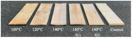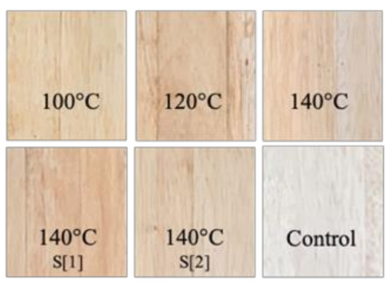 In this study, there was a difference in wood color between untreated wood (control) and treated wood (100, 120, 140, and sandwich 140 °C), as shown in Figure 6. Wood may be modified mechanically and physically by high-temperature and high-pressure treatment [52]. Moreover, the color parameter, particularly the overall color difference, can be used to quantify and predict the strength of wood.