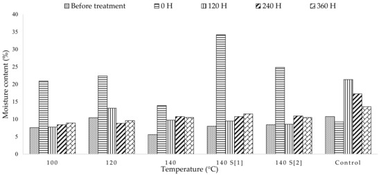 Several studies demonstrate that the minimum temperature required to modify wood is 100 °C, with water absorption decreasing as the temperature increases above 100 °C [62,63]. Compared with control board, the treated wood has a lower EMC after 120 H. The decrease in the EMC of wood results from a decline in the quality of the hemicellulose, induced by high-temperature and -pressure treatment, which impairs the wood’s ability to bind OH. The lower the EMC value of wood, which should be significantly less than the fiber saturation limit of between 21 and 32%, the better the wood’s physical and mechanical properties [64], meaning these mechanical and physical properties will increase as the moisture content decreases [65].