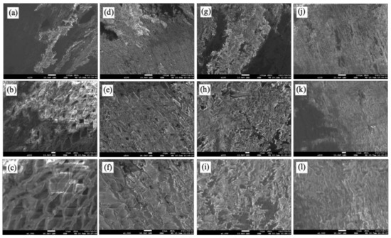 SEM micrographs: control (a) 100 , (b) 500 , (c) 1000 ; 100 °C (d) 100 , (e) 500 , (f) 1000 ; 120 °C (g) 100 , (h) 500 , (i) 1000 ; 140 °C (j) 100 , (k) 500 , (l) 1000