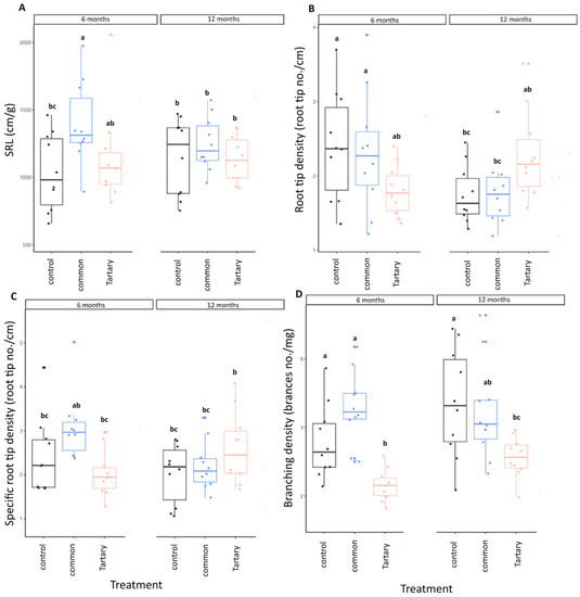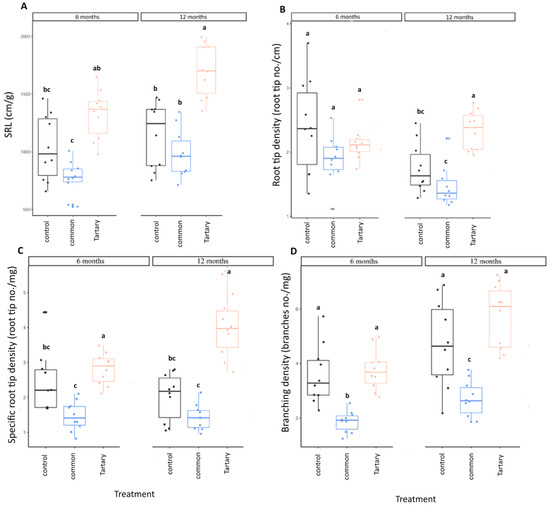 The impact of buckwheat husks on root parameters at 6 months and 12 months after spore inoculation: (A) specific root length (SRL) (cm/g); (B) root tip density (no. of root tips/cm); (C) specific root tip density (no. of root tips/mg) and (D) branching density (no. of branches/mg). Different letters mark statistically different results (Tukey HSD, p ≤ 0.05).
