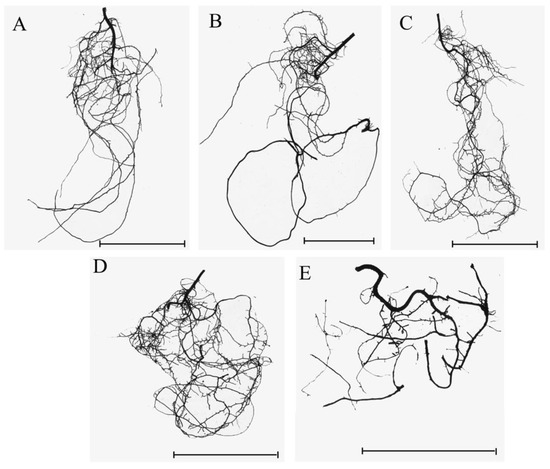 Examples of root system scans of silver fir seedlings with different treatments, 12 months after spore inoculation: (A) control treatment; (B) treatment with added common husks; (C) treatment with added Tartary buckwheat husks; (D) treatment with added common bran; (E) treatment with added Tartary buckwheat bran. The bar denotes a length of 5 cm.