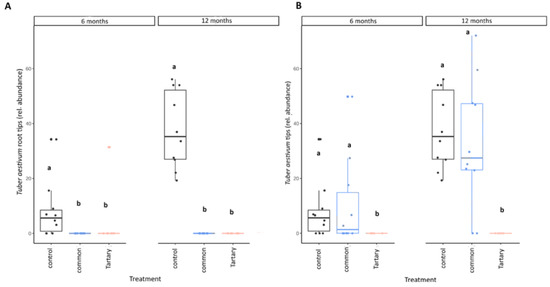 Summer truffle mycorrhization level at 6 months and 12 months after spore inoculation: (A) impact of added buckwheat husks; (B) impact of added buckwheat bran. Different letters mark statistically significant results (Kruskal–Wallis, p ≤ 0.05).