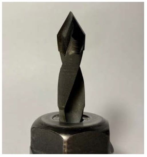 All experiments were carried out under industrial-like conditions, with industrial CNC machine tools (Figure 1), standard tungsten carbide drill bits (Figure 2), and mass-produced melamine faced particleboards.