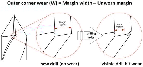 The tool wear was monitored manually in an objective way using workshop microscopes. The drill wear indicator was the size of outer corner wear denoted by the symbol “W” (Figure 3).