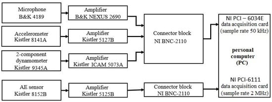 Scheme of the system used for measuring and digital recording of 5 selected signals generated during drilling: feed force, drilling torque, noise, ultrasonic acoustic emission (AE), and acceleration of jig vibration [].