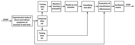 - Fourthly—the time series structure of the obtained data can be ignored (does not have to be analyzed). This assumption has a significant advantage—it facilitates the using and testing of standard algorithms commonly intended for three-class classification. Unfortunately, it also has controversial consequences. One of them is analyzing the data obtained while working with a tool that would normally be previously replaced with a new one. Therefore, it is worth emphasizing that this assumption is not in line with industrial standards and practice.