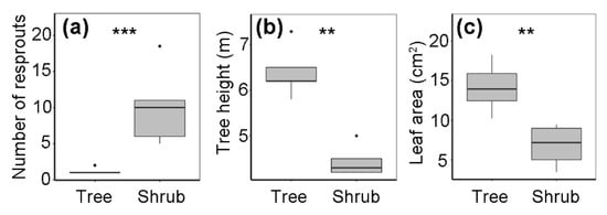 Box plots show the plant morphological differences between Quercus mongolica trees and shrubs for (a) number of resprouts, (b) tree height, and (c) leaf area. The horizontal lines represent the 25%, 50%, and 75% quantiles. The vertical lines show the 5% and 95% quantile. The stars show the results of a Wilcoxon rank-sum test: ***, p < 0.01; **, p < 0.05.