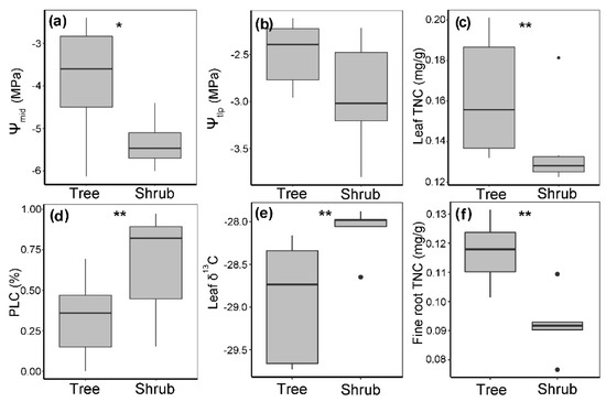 Box plots show the difference between drought stress, tolerance, and nonstructural carbohydrate performance of Quercus mongolica trees and shrubs. We report (a) midday leaf water potential (Ψmid) and (d) percentage loss of stem hydraulic conductivity (PLC) as the drought stress that plants are bearing; (b) leaf turgor loss point (Ψtlp) and (e) leaf δ13C as plant drought tolerance ability; and plant (c) leaf and (f) fine root total nonstructural carbohydrate (TNC) of Q. mongolica individuals. The horizontal lines represent the 25%, 50%, and 75% quantiles. The vertical lines show the 5% and 95% quantile. The stars show the results of a Wilcoxon rank-sum test: **, p < 0.05; *, p < 0.1.