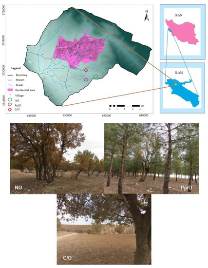 Geographical location, upper, and some photos of the study area (Zagros forest, Western Iran); notes: NO = natural stand of oak; Pp/O = pine plantation on ancient oak forest and C/O = cropland on ancient oak forest.