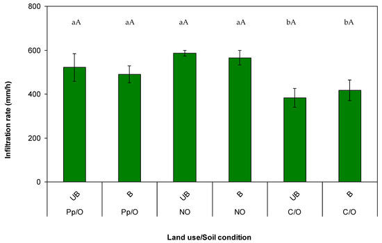 Soil infiltration rates measured using a rainfall simulator in different land uses (Pp /O = pine plantation on ancient oak forest; NO = natural stand of oak; C/O = cropland on ancient oak forest) and soil conditions (UB = unburned soil; B = burned soil) in the experimental area (Zagros forests, Western Iran). Different lowercase letters indicate significant differences among land uses, while different capital letters indicate significant differences between soil conditions, according to Tukey’s test (at p < 0.05).