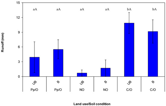Among the unburned sites, the cropland produced the highest runoff (10.9 ± 2.13 mm), while the oak forest gave the lowest volume (0.70 ± 0.63 mm). In the pine forest, an intermediate production of runoff was measured (3.64 ± 3.14 mm). Contrarily, in burned sites, the runoff decreased in the cropland (9.16 ± 2.38 mm), and increased in both of the pine and oak forests (5.53 ± 1.94 mm, pine, and 1.73 ± 1.67 mm, oak) (Figure 3). The ANOVA showed that only the differences among the land uses was significant (p < 0.05), while the influence of the soil condition and its interaction with the land use was found not significant (Table 2).